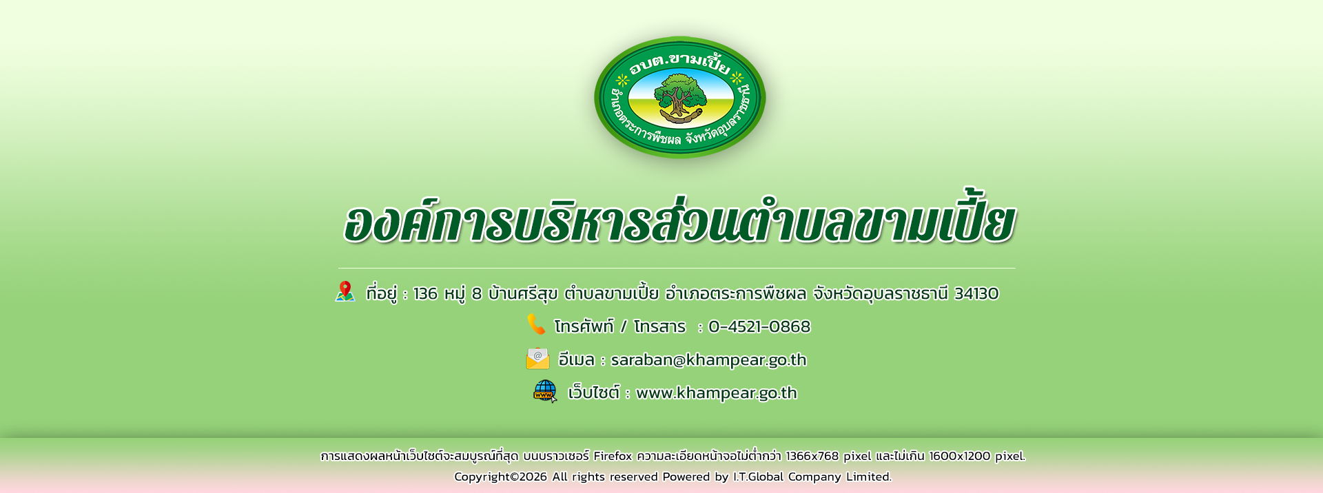 ยินดีต้อนรับเข้าสู่ องค์การบริหารส่วนตำบลขามเปี้ย ติดต่อสอบถาม : โทรศัพท์ / โทรสาร (แฟกซ์) : 0-4521-0868 อีเมล์ : saraban@khampear.go.th